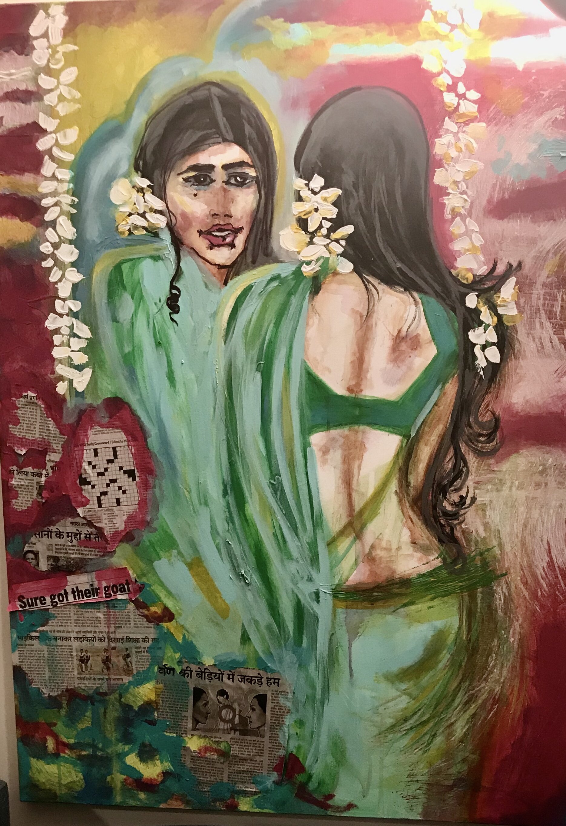 Quarantine has increased incidents of Domestic Violence. In the bottom left of Domestic Violence is a Hindi newspaper saying Castism in our society and the favoring of boy over girl children is a curse! The lady in the painting sees herself but shoves aside the issues to be dealt, as depicted in the newspapers. The violence is given less importance than her beauty.