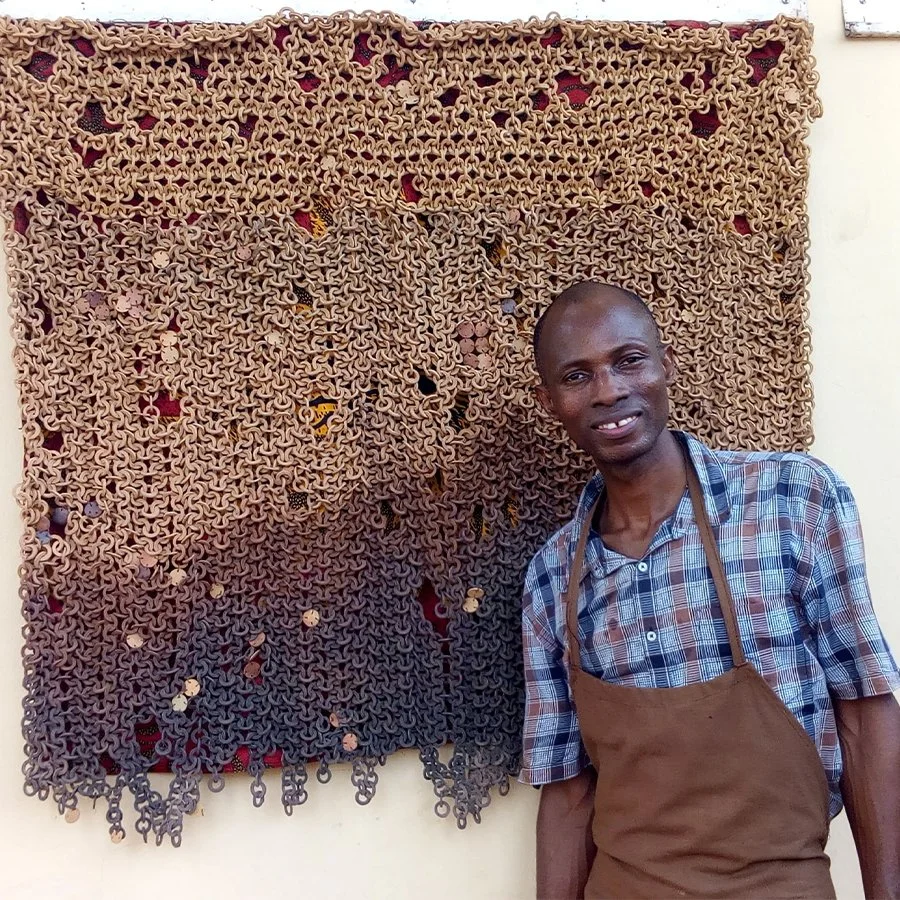 Ceramic Artist, Poet and Academic, Mr. Onuzulike, hails from Nsukka, Nigeria where he is Director of the Institute of African Studies at the University of Nigeria. He explores the aesthetic, symbolic and metaphoric nature of clay. His recent work, currently on view at HVMOCA, is inspired by such natural resources as yam tubers, palm kernel shells and honeycombs that he produces in ceramic in mass amounts and weaves together laboriously into Afro Centric tapestries referencing the slave trade and the imbalance in political relations between Africa and the West. A deeply religious person, his poetry sings to the ethereal in us all.