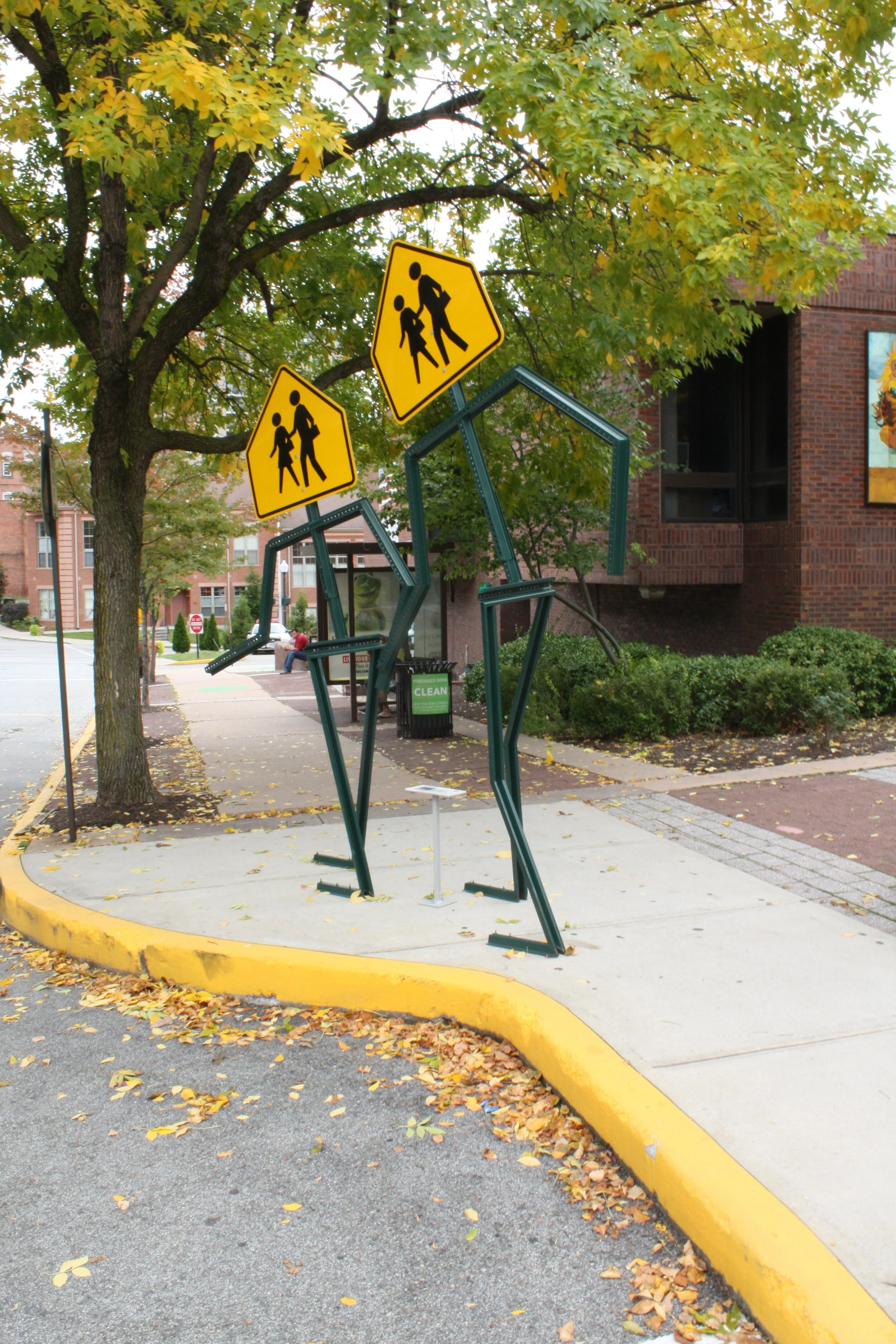 This sculpture animates the gesture of common crosswalk signs. Humor and vitality are added to otherwise utilitarian street signage, thereby allowing the viewer to identify more closely with the urban environment. About the Artist: Leon Reid iV is a Brooklyn based artist best known for his street art installations made in New York and London at the turn of the 21st Century. In 2005, Reid iV began completing commissioned based public art installations in cities such as Berlin, Sao Paulo and Stavanger Norway. In 2011, he developed a new body of work titled TECH-ART: Soul for technology. This new body of work reflects the look and feel of the information age in traditional drawing painting and sculpture. Reid IV has shown his works in traditional exhibitions as well as public installations, large-scale projects and street art, including Pandemic Gallery, Brooklyn, NY, Helmet Gallery, Munich, Germany, De Ruyterkade, Amsterdam, and ATM Gallery, Berlin, Germany. Reid iV co-authored and was the subject of street-art novel "The Adventures of Darius and Downey" published by Thames & Hudson 2008. Gift of the Marc and Livia Straus Family Foundation to the City of Peekskill