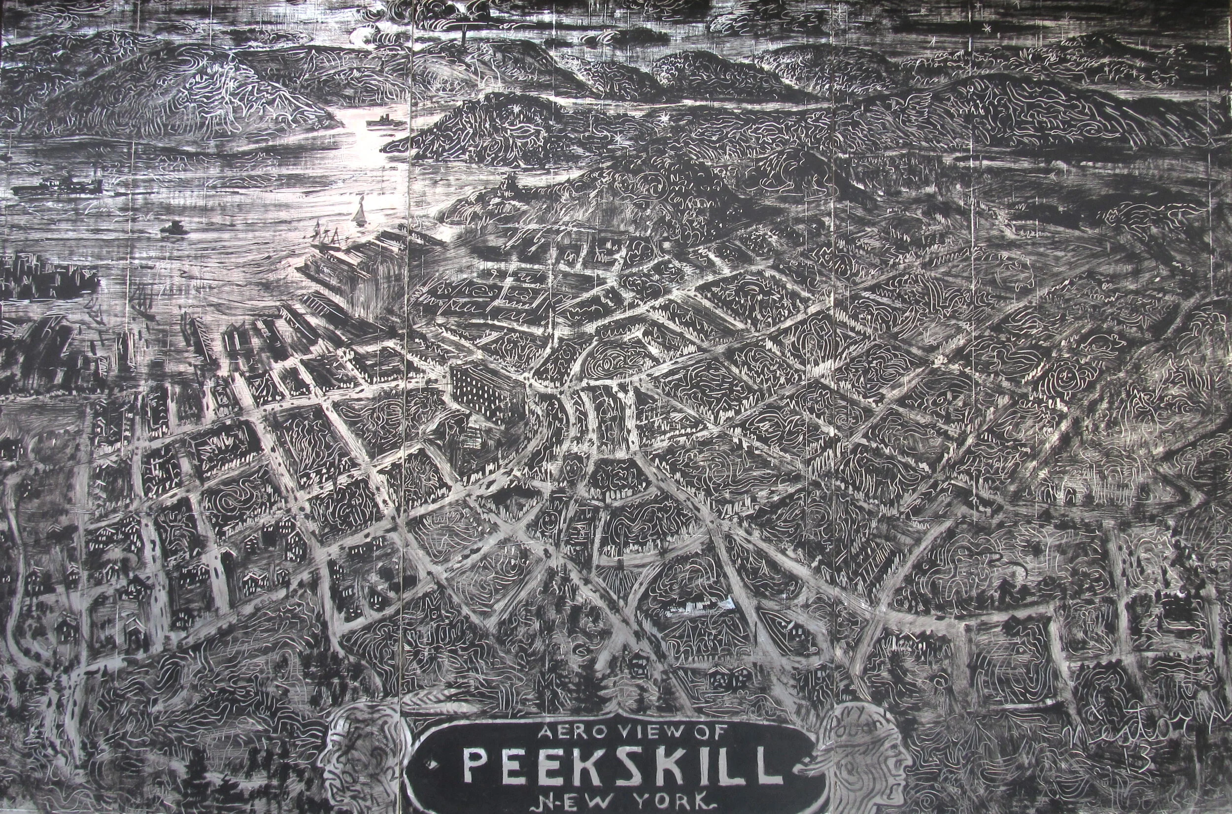 This mural depicts a panoramic view of the city of Peekskill based on a print published in the early 1900s. The result is an image similar to an old daguerreotype. Madalengoitia is currently immersed in a new series of drawings using the technique of etching designs onto a scratchboard surface. For this mural, he employed the same technique. First he applied black acrylic to the silver side of insulation board, then he ‘draws’ designs by using plastic utensils such as knifes, spoons, and credit cards to remove the black paint which forms the image.